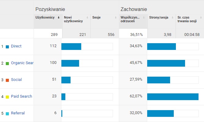 Statystyki Google Analytics – skąd pochodzi nasz odbiorca? Źródło. Pozyskiwanie. Paid Search, Serach, Direct, Organic Search, Refferal, Displa, GDN..
