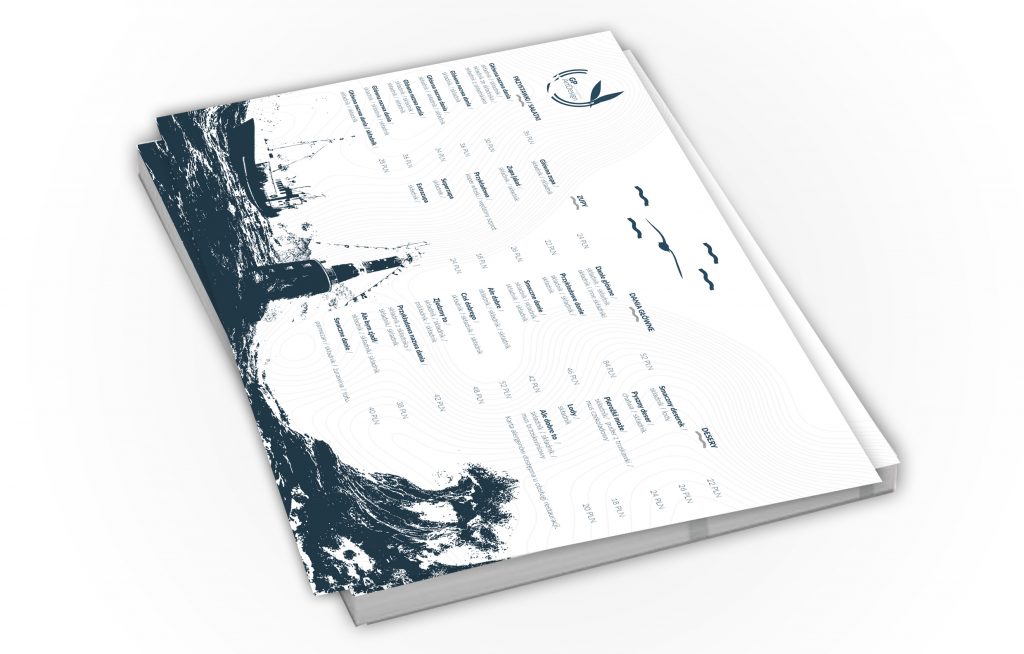 Sample menu card design for a restaurant located by the sea. The colors reflect the colors of the restaurant, and the seagulls say – this is right by the sea, where you can hear the sound of waves and birds singing. And at the bottom there is a drawing that does not need to be explained – a rough sea, a lighthouse and a cutter.